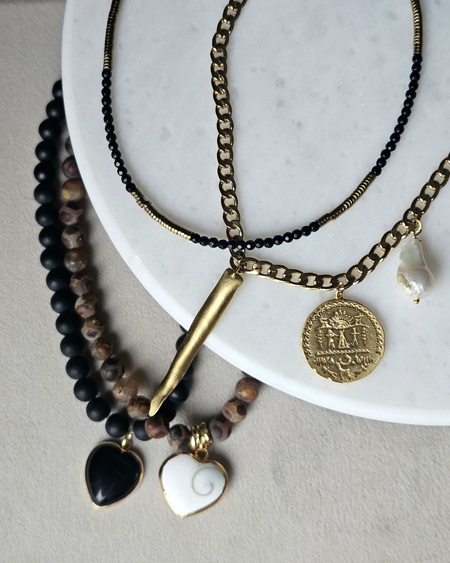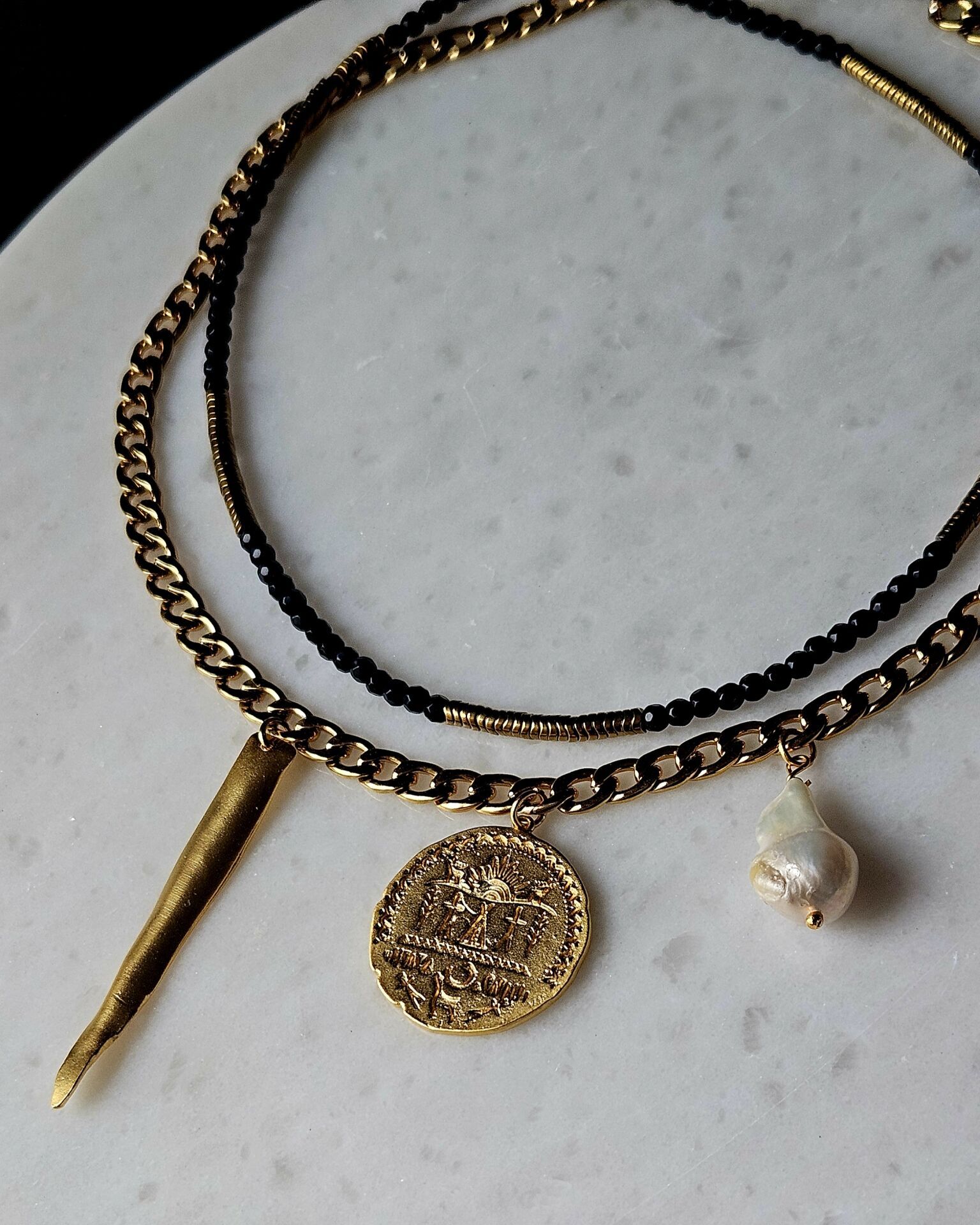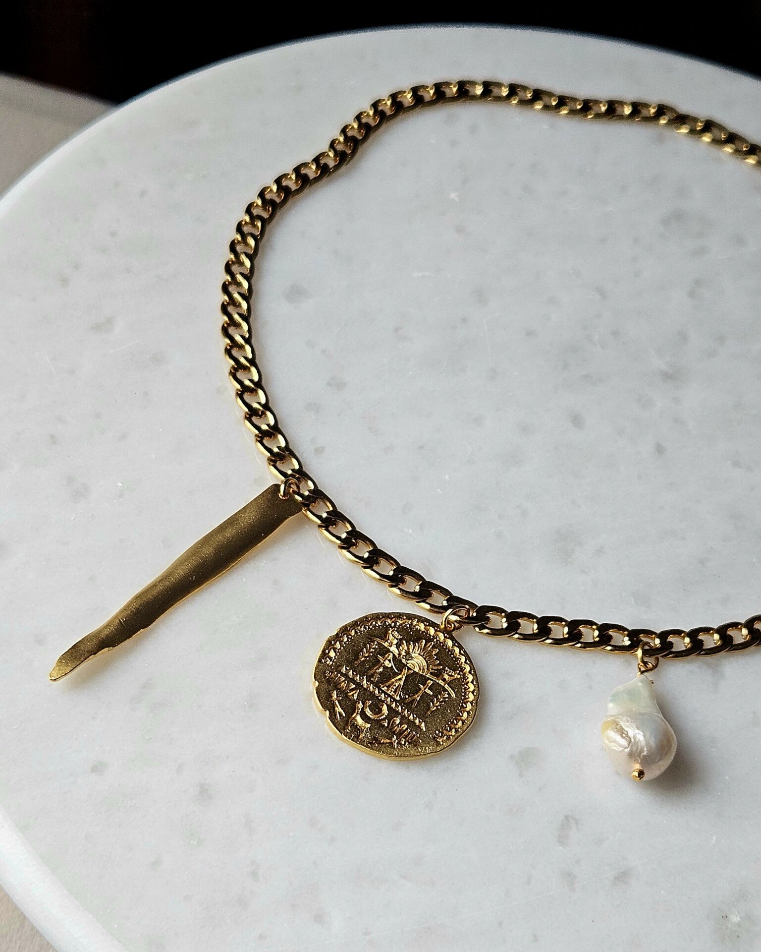 - Malzeme : Gerçek inci, pirinç üzeri altın kaplama sallantılar ve çelik zincir.