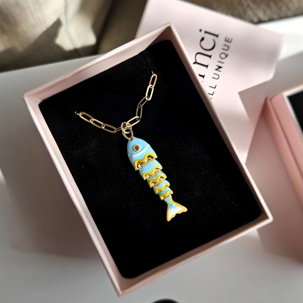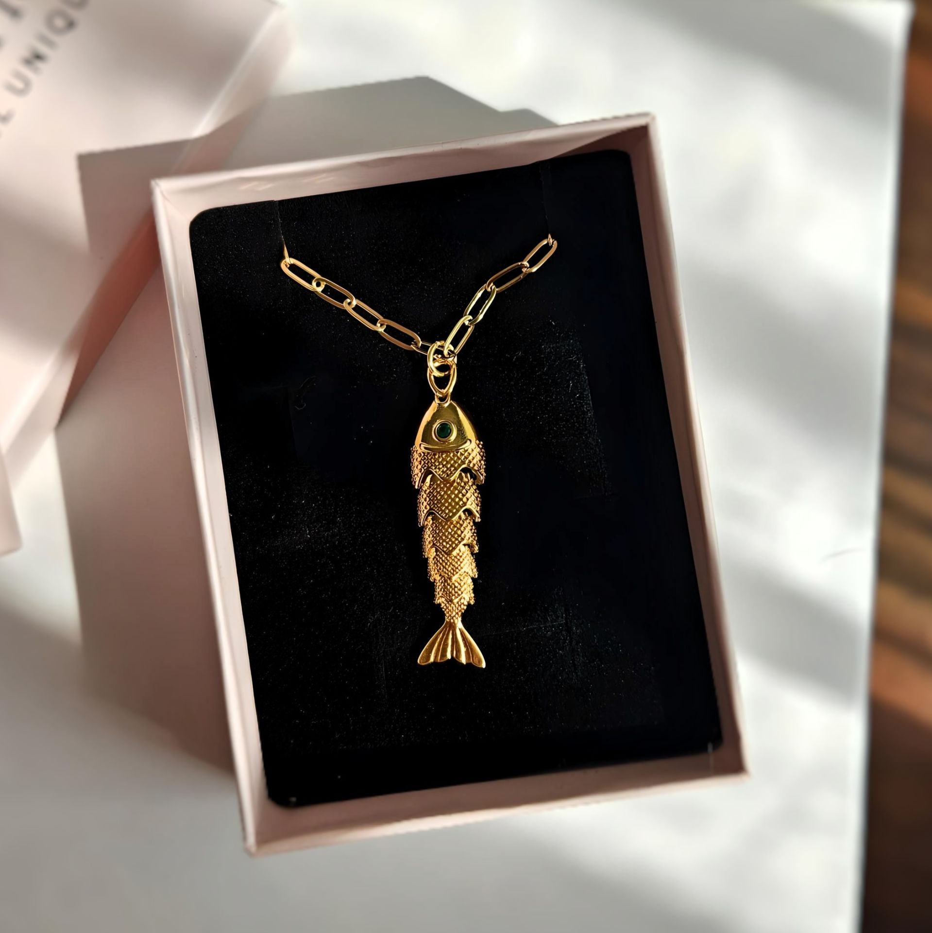 - Malzeme : Çelik zincir ve kaliteli kaplama pirinç balık figürü. Korunduğu müddetçe kararmaya dayanıklıdır.