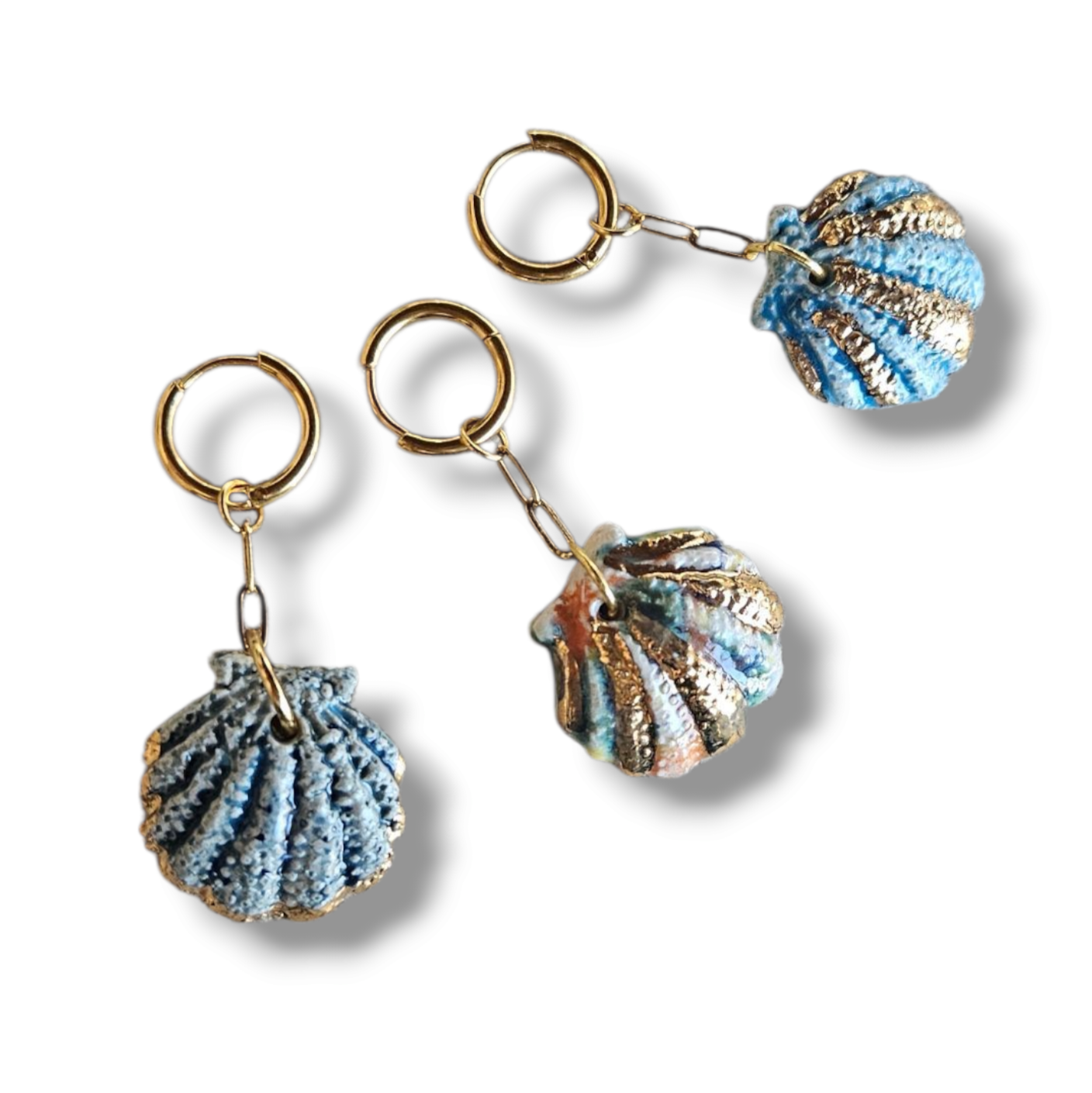 - Malzeme : Seramik deniz kabuğu, çelik zincir ve küpe bağlantısı.