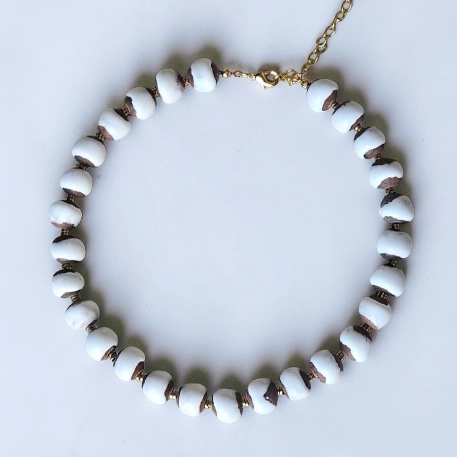 - Malzeme : Clay Kolye, hematit ve toprak taş ile yapılmıştır. Boncuk boyları yaklaşık 10 mm'dir.
