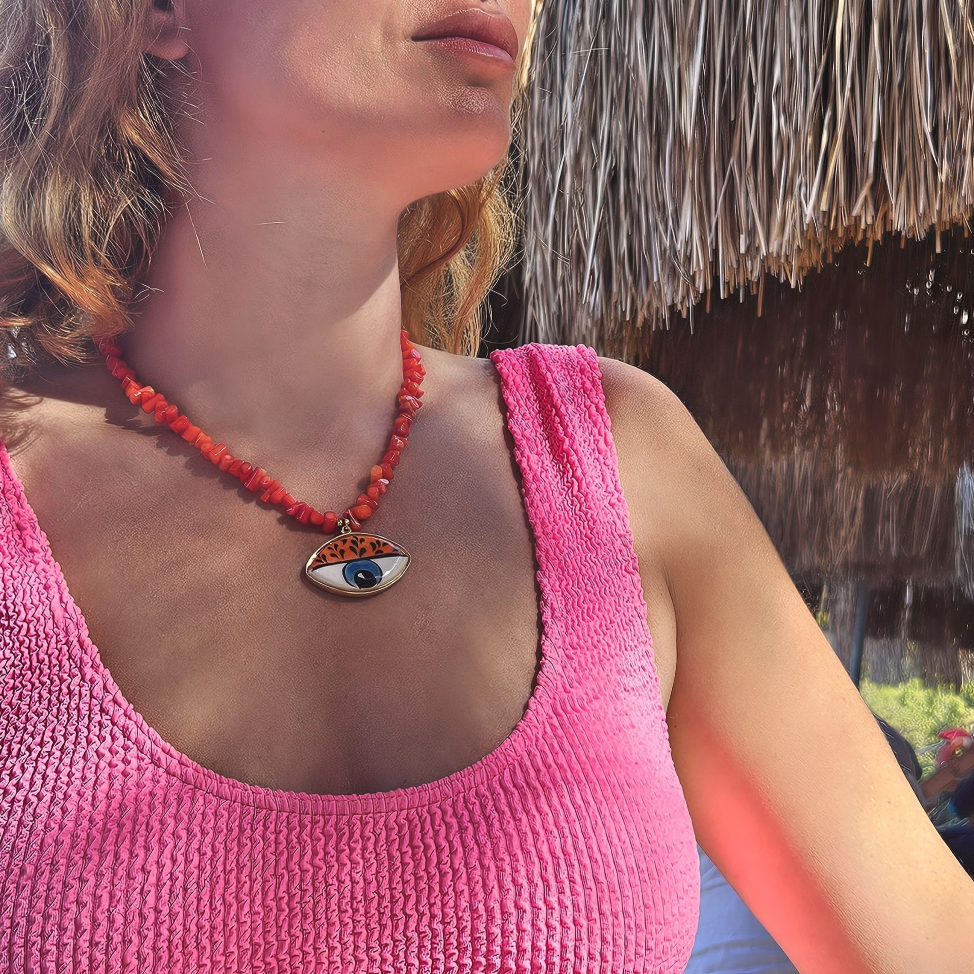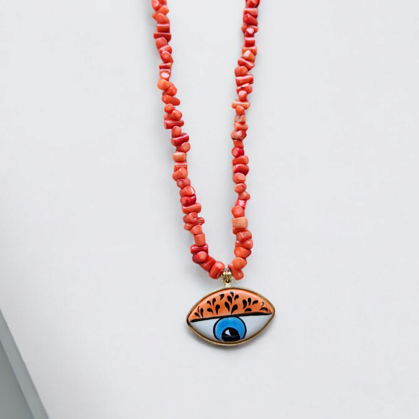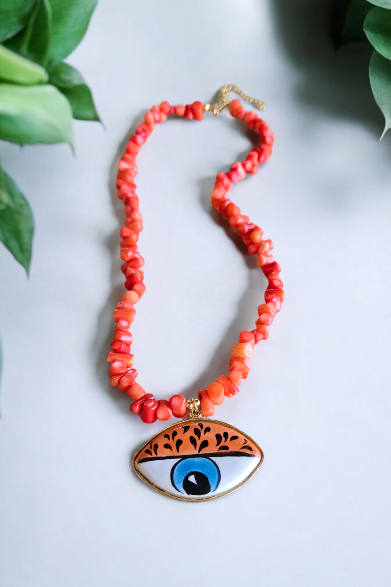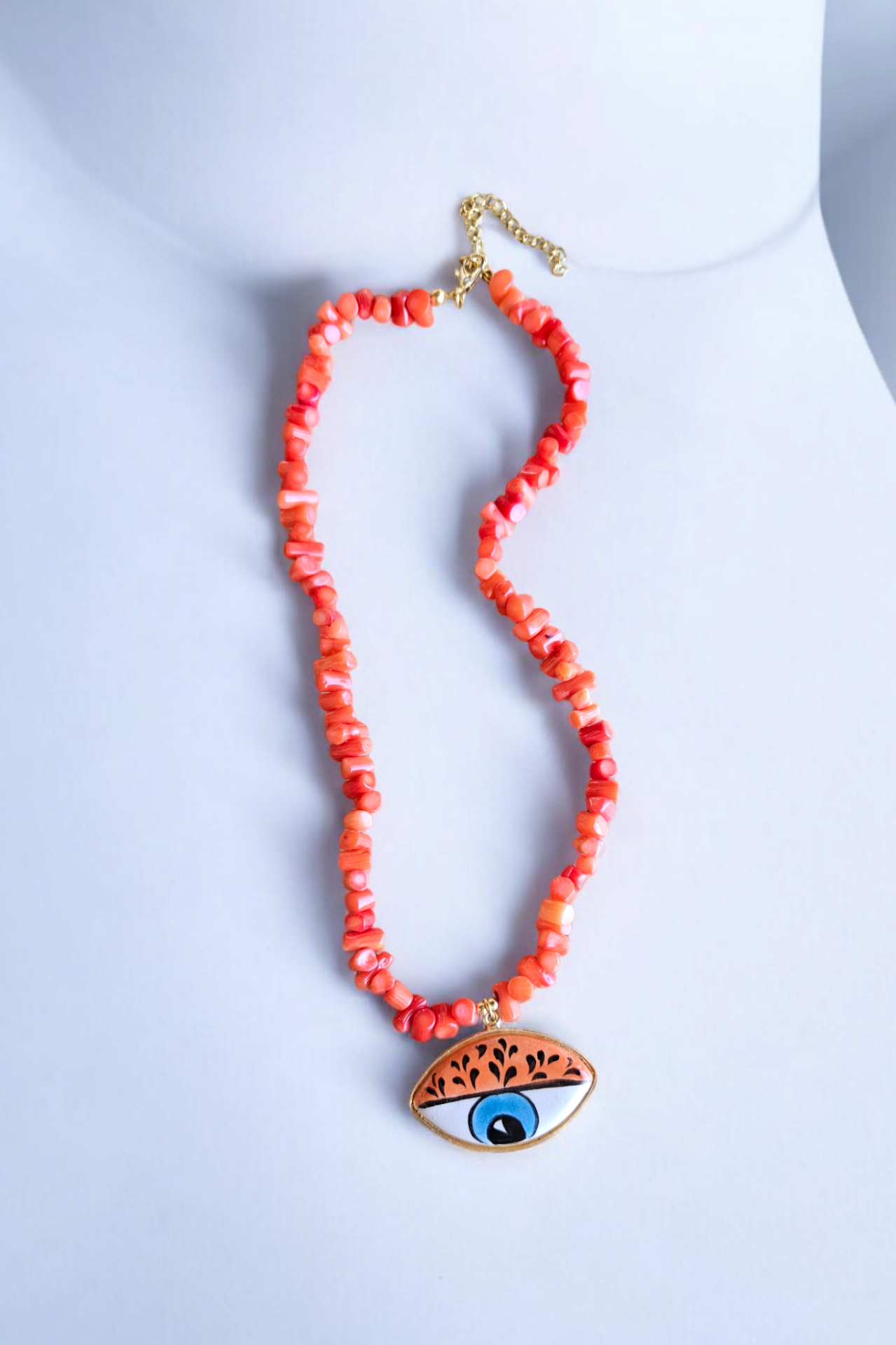 - Coral Eye Kolye mercan taşları ve el yapımı seramik göz ile yapılmıştır.