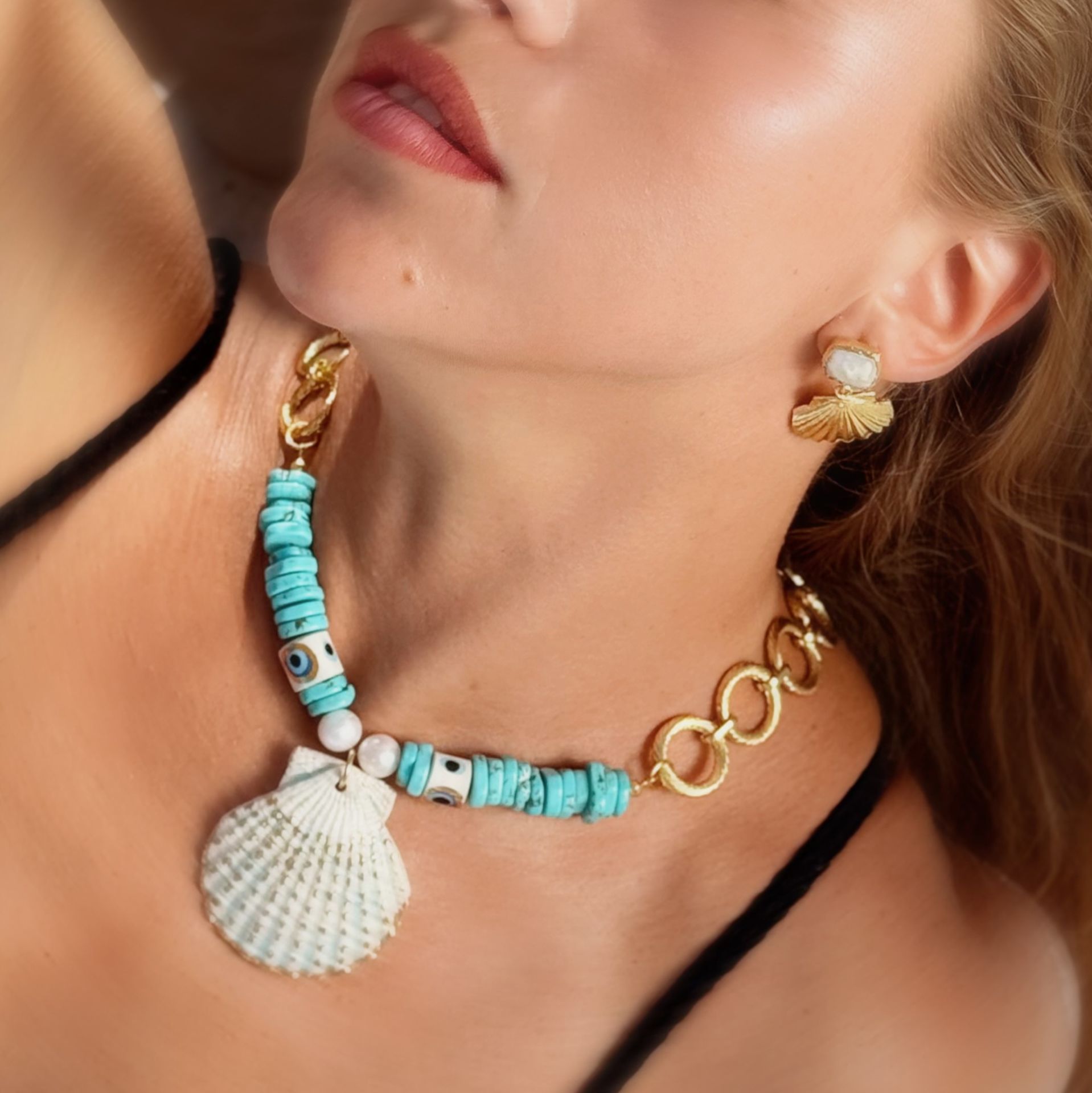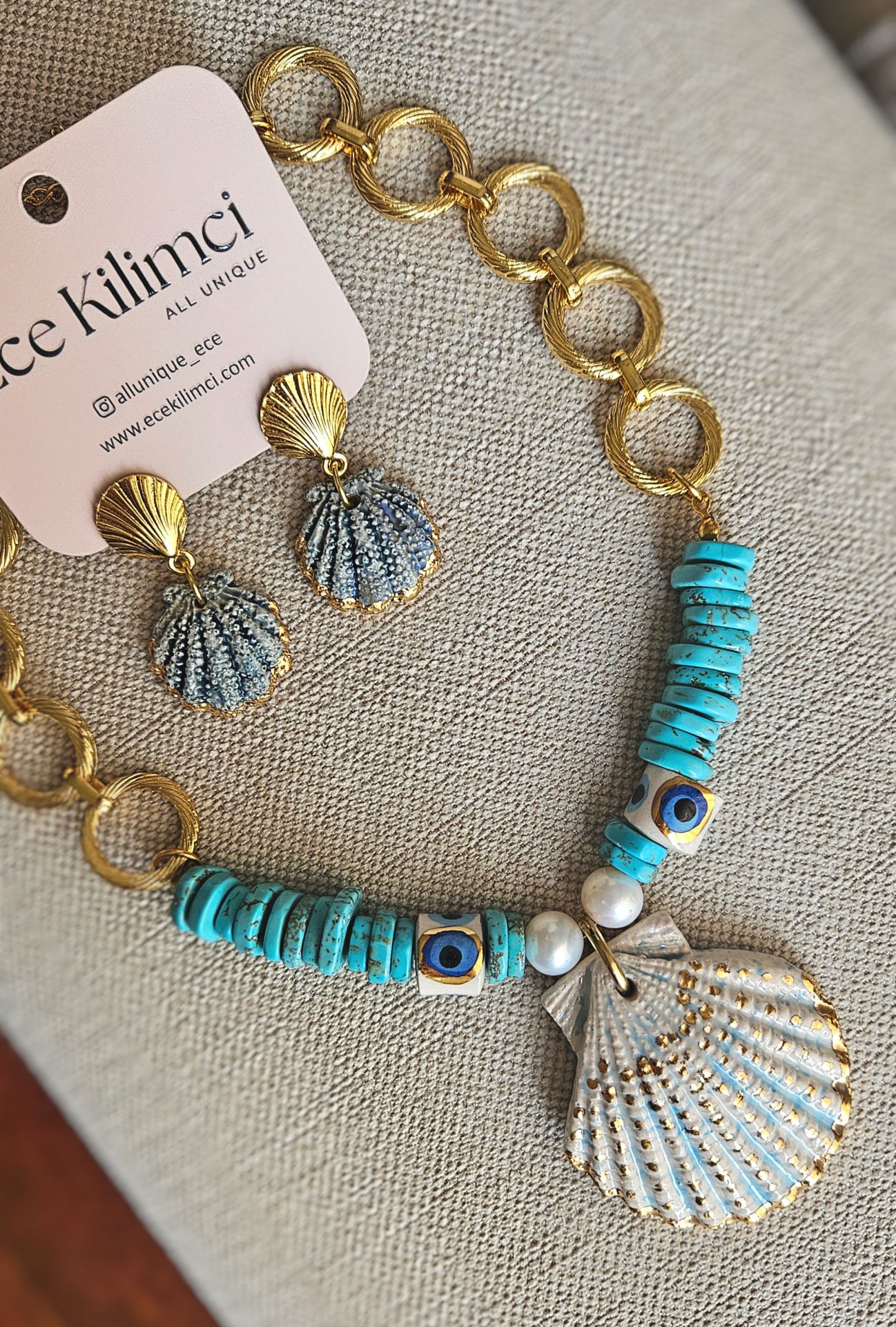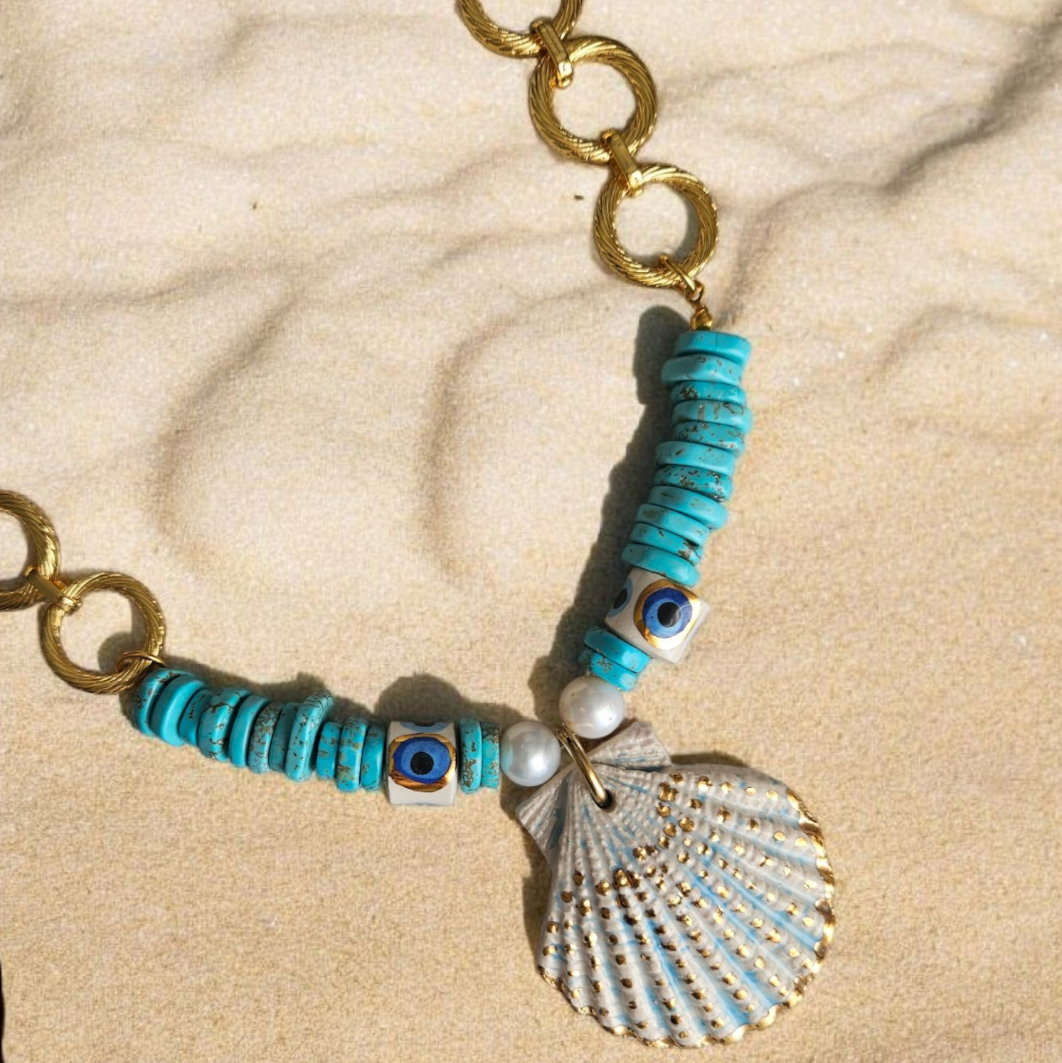 - Malzeme : Turkuaz doğal taş, gerçek inci, seramik nazar boncuk ve deniz kabuğu. Zincir yüksek kalite altın kaplamadır.