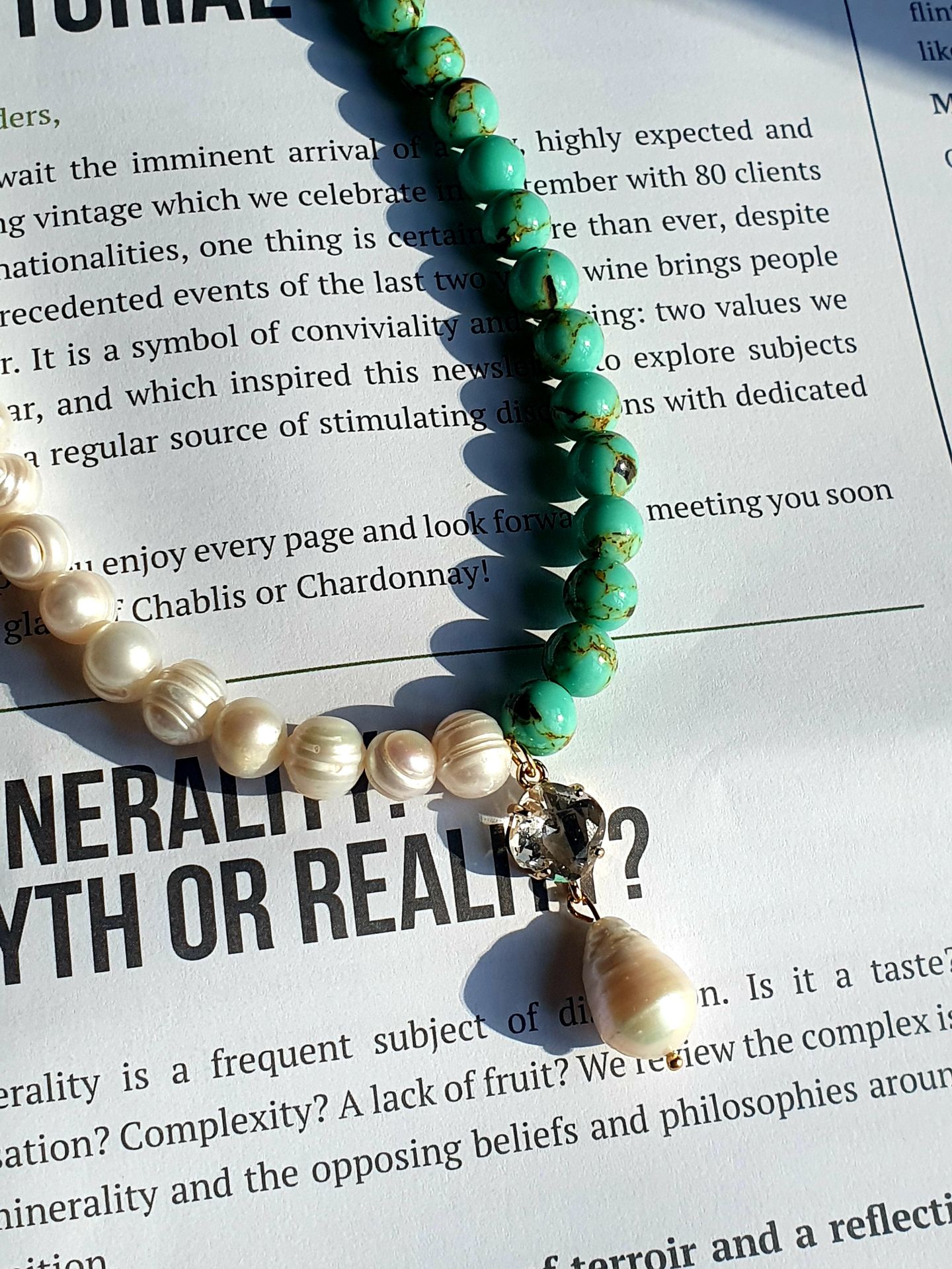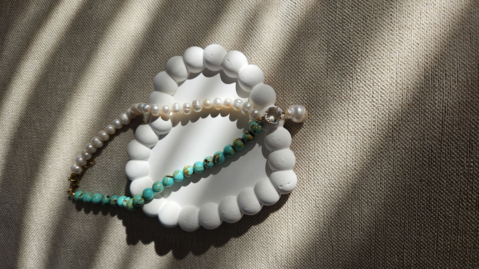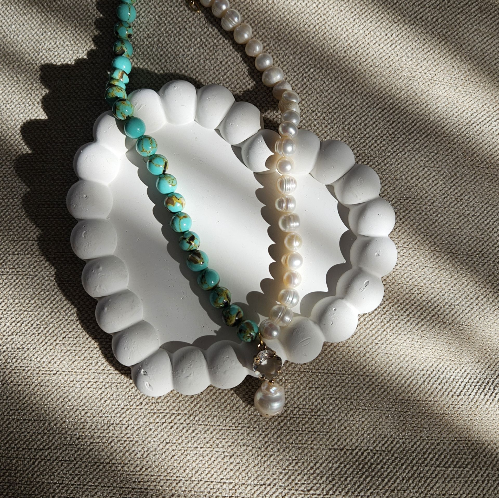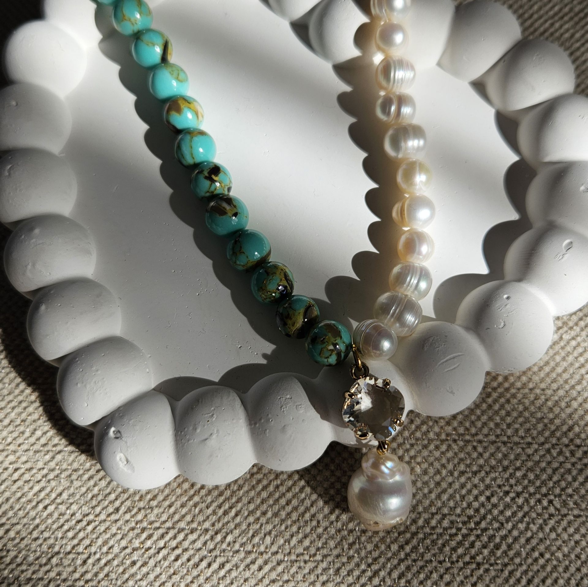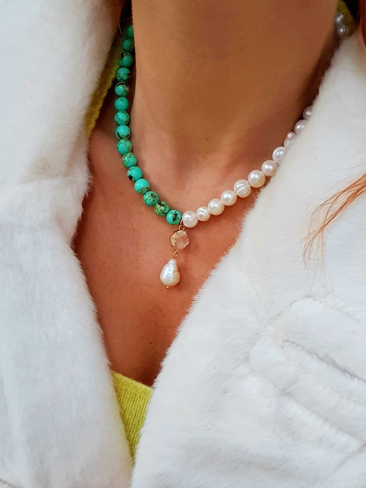 Elsa kolye inci ve yeşil cam boncuklar ile yapılmıştır. Ucunda kullanılan inci barok incidir. Uzun süreli kullanım için kimyasal temasına dikkat edilmesi tavsiye edilir.