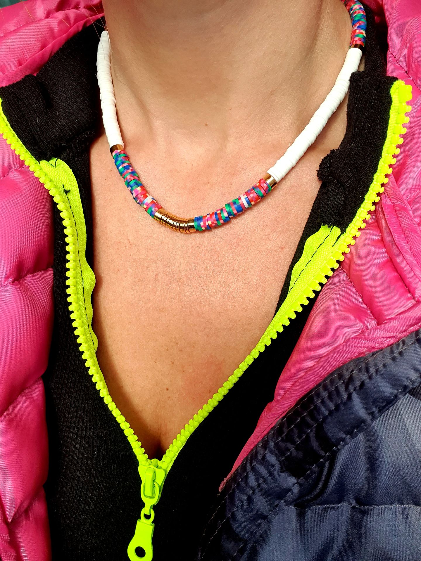 Hawaii kolye karışık renk fimo boncuk ve 1. Sınıf altın kaplama ara aparatlar ile yapılmıştır. Uzun süreli kullanım için kimyasal temasına dikkat edilmesi gerekir.