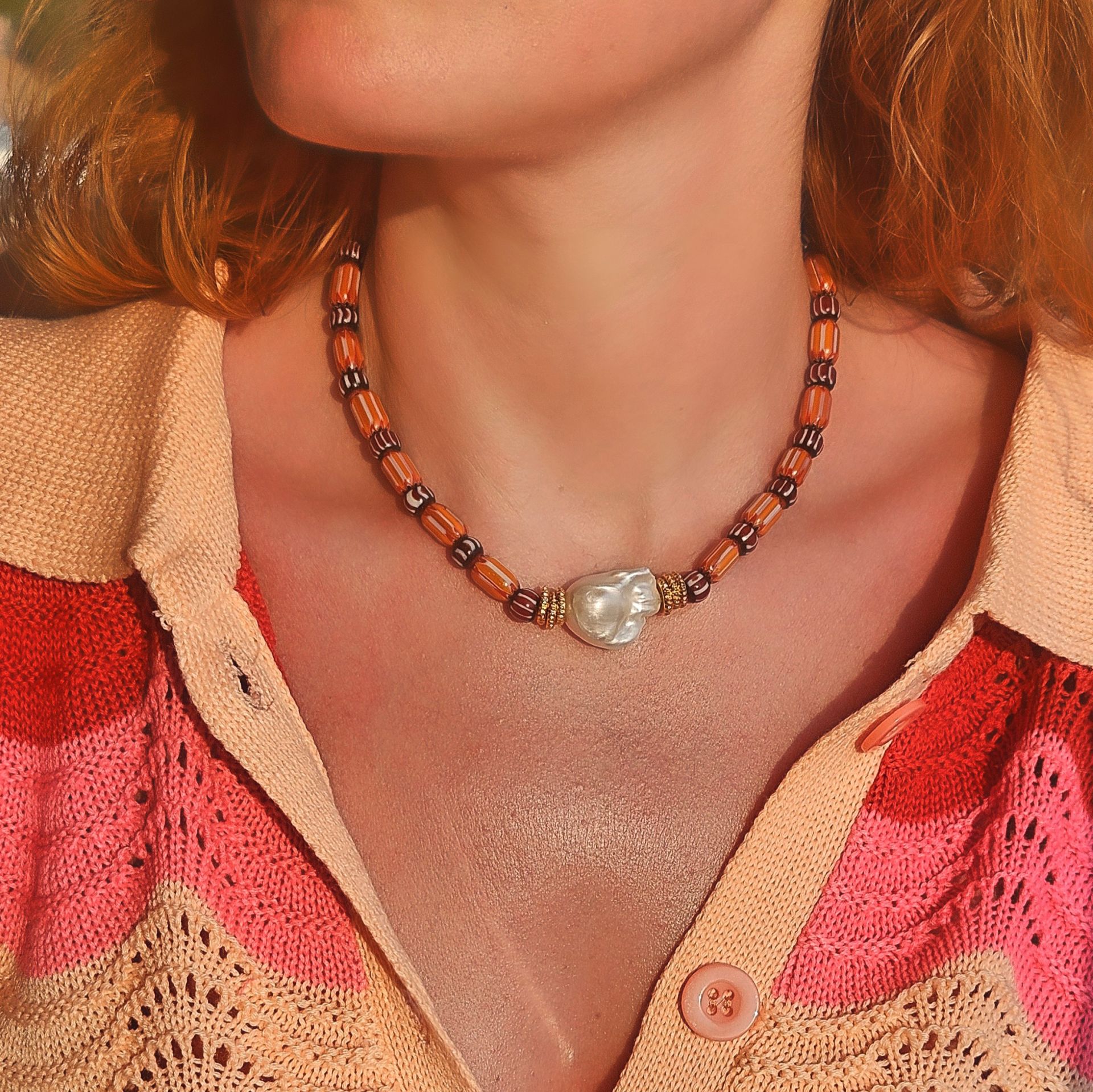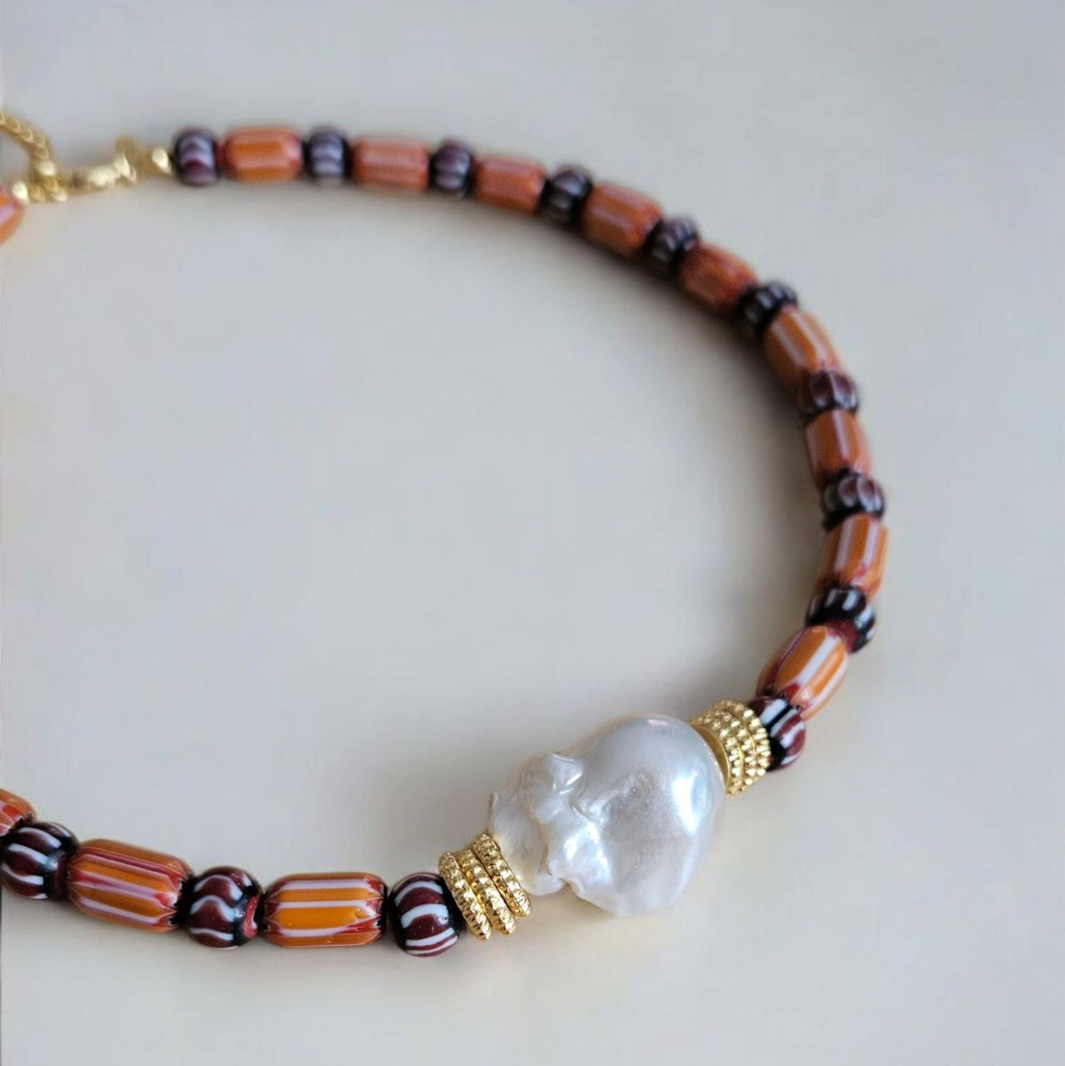 - Malzeme : Barok inci, nepal işi cam boncuklar ve altın kaplama pirinç disk boncuklar.