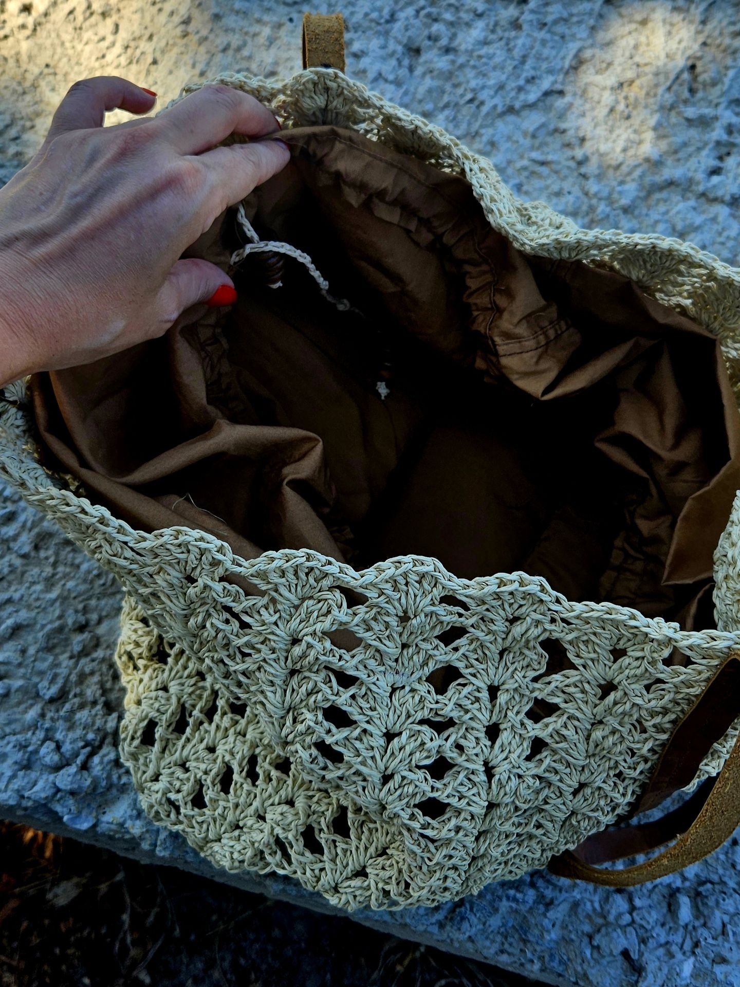 - Malzeme : Kağıt ip ile elde yapılmıştır. Büzmeli torba astarlıdır.