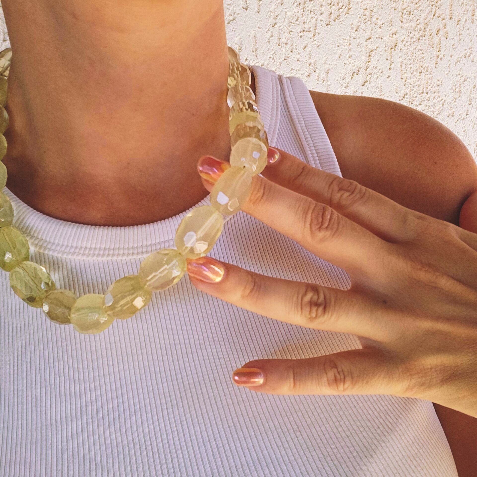 - Malzeme : Has limon kuvars doğal taşıdır. Kapama aparatları pirinç üzeri altın kaplamadır.