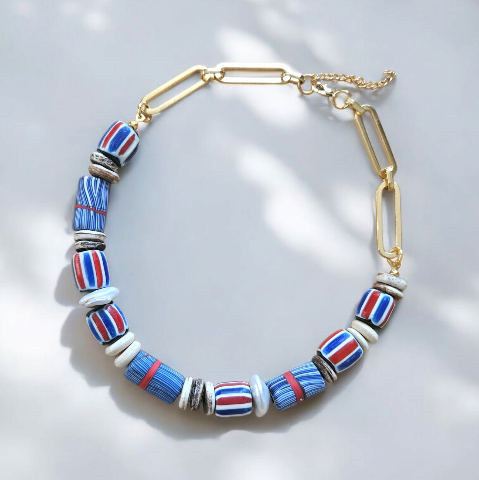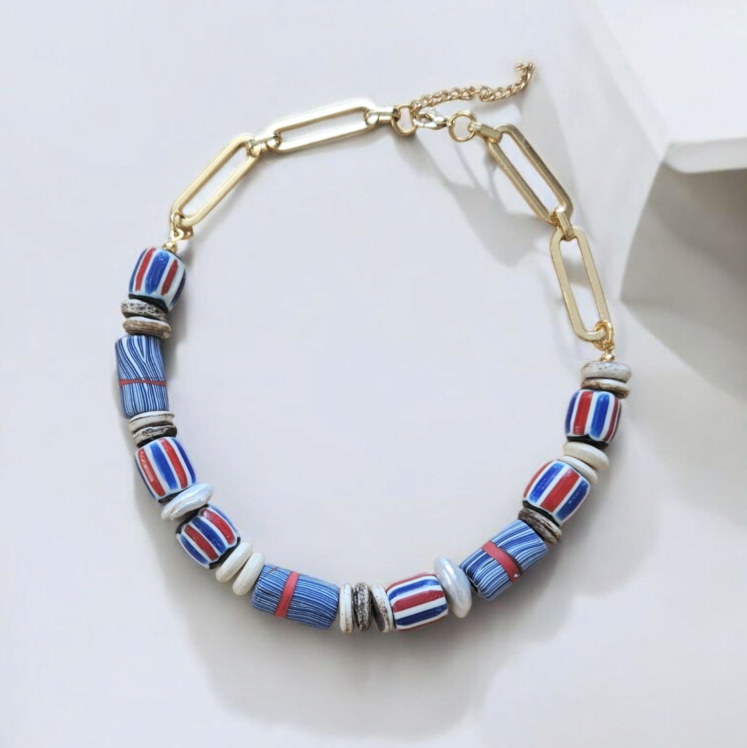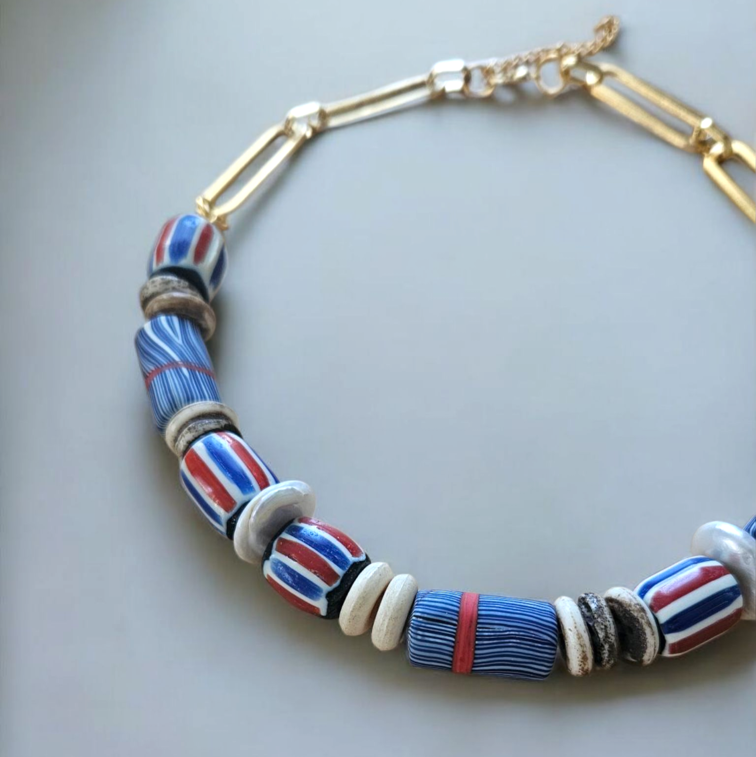 - Malzeme : Afrika chevron cam, tibet rondela, gerçek inci ve pirinç üzeri altın kapalama zincir.