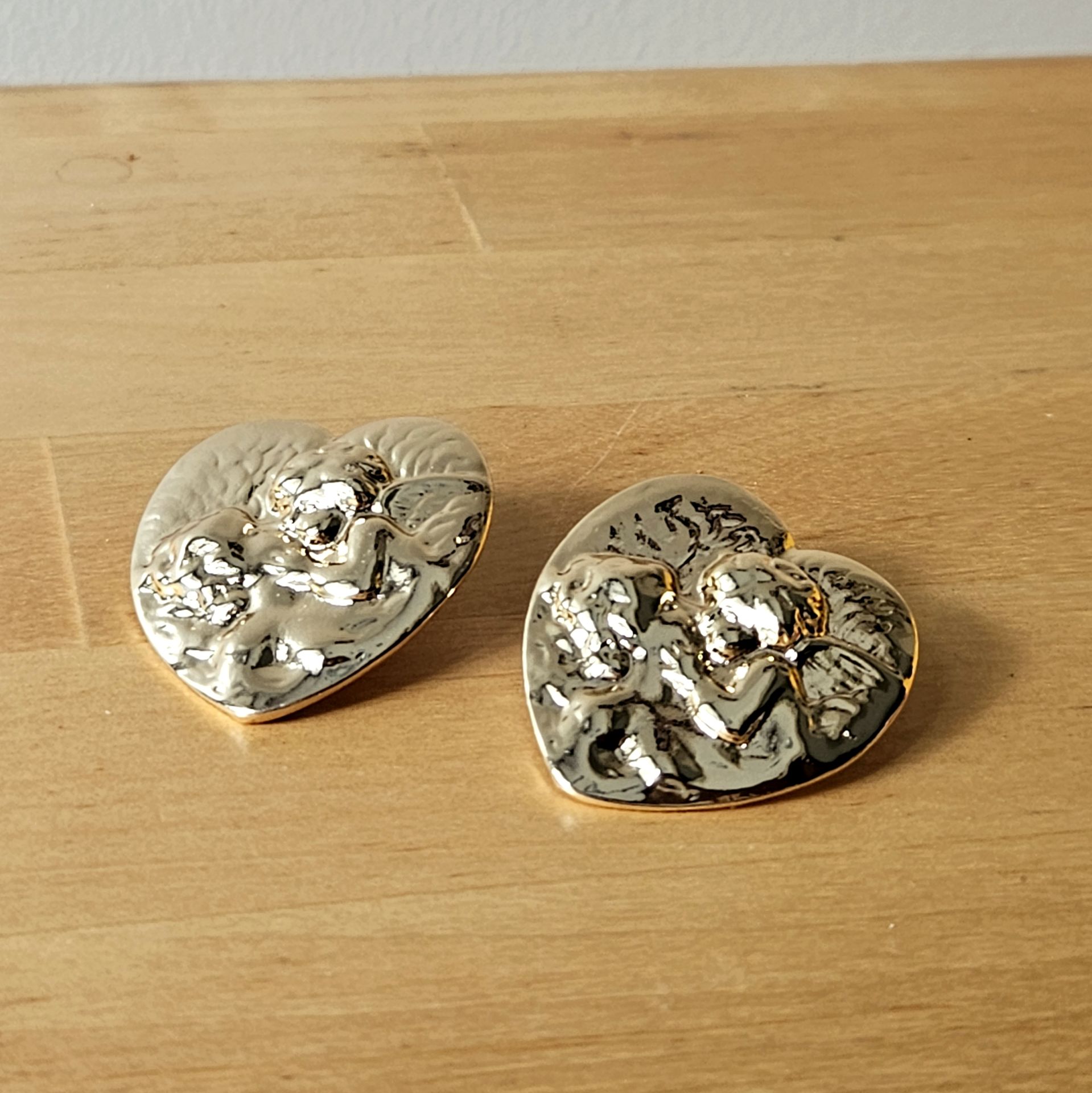 Melek desenli plaka küpe pirinç üzeri altın kaplamadır. Uzun süreli kullanım için kimyasal temasına dikkat edilmesi tavsiye edilir.
