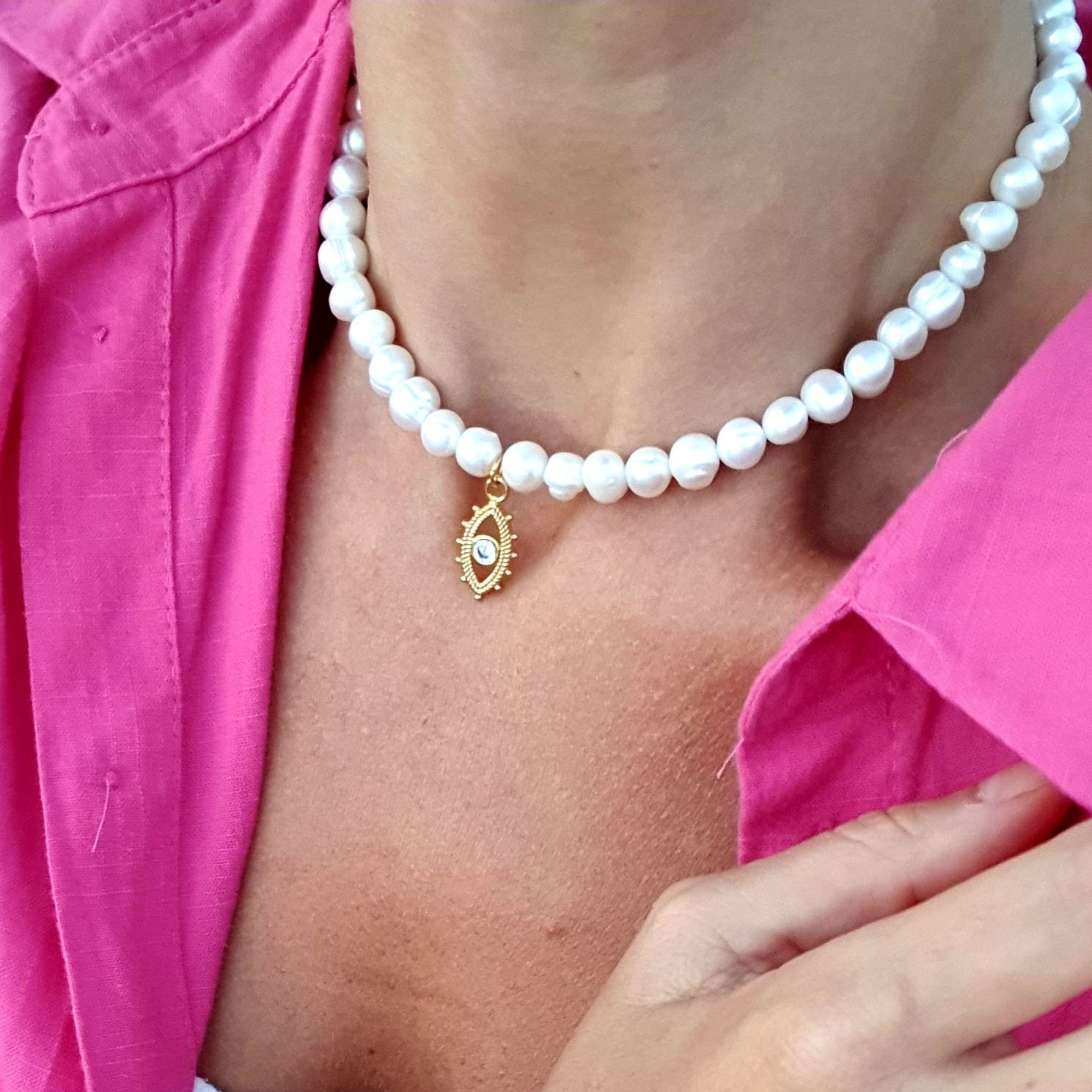 - Mojo kolye zirkon göz sallantı ve tatlı su incileri ile yapılmıştır.