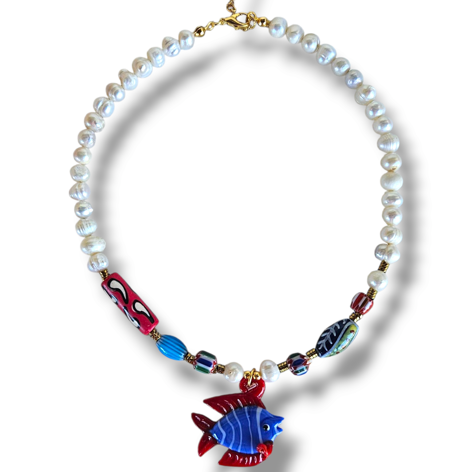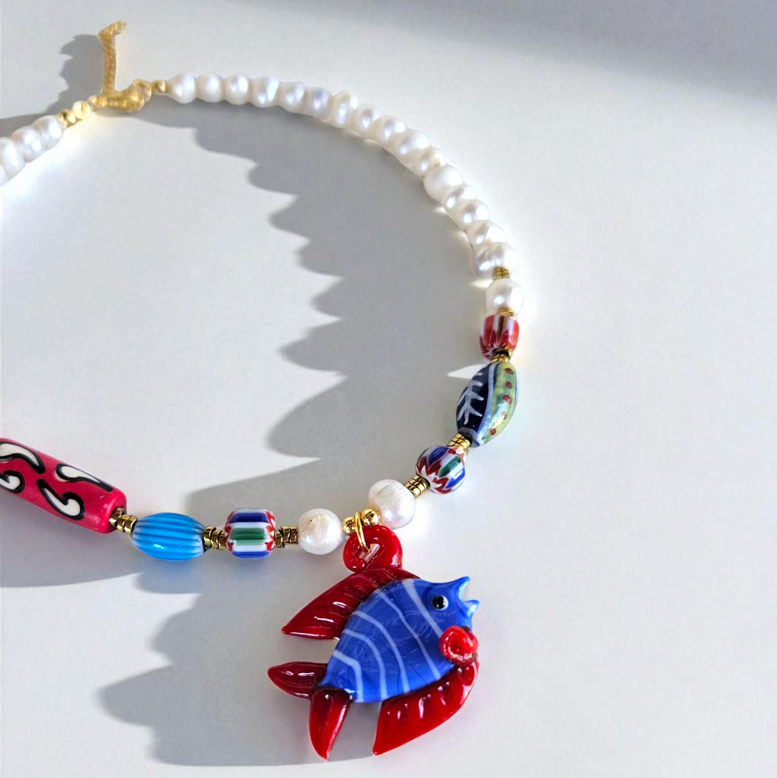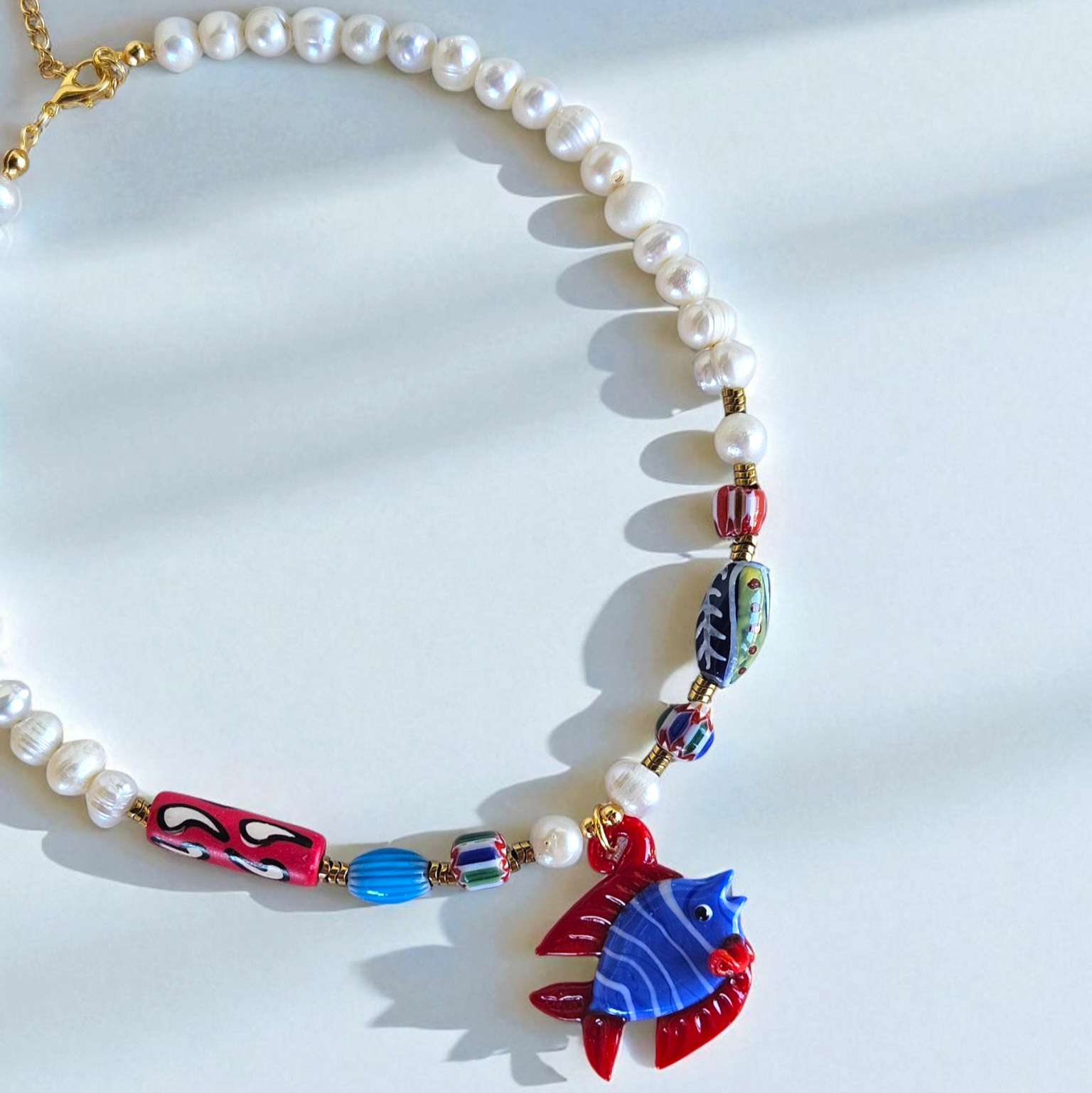 - Malzeme : Nepal, tipet ve seramik boncuklar, gerçek tatlı su incileri, hematit ve cam balık.