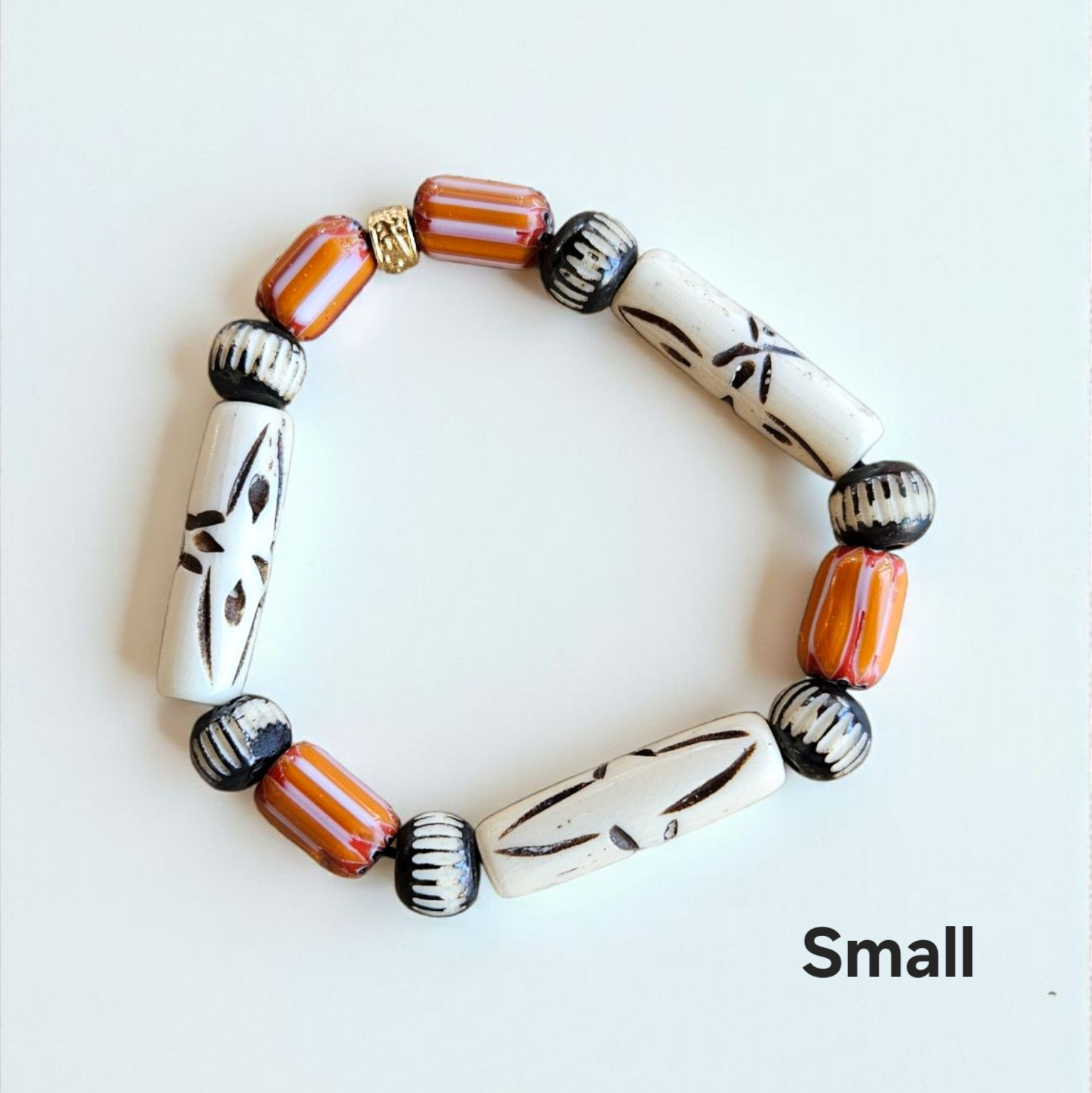- Malzeme : El yapımı reçine ve kemik boncuklar. Turuncu chevron cam boncuklar. Lastik bileziktir.