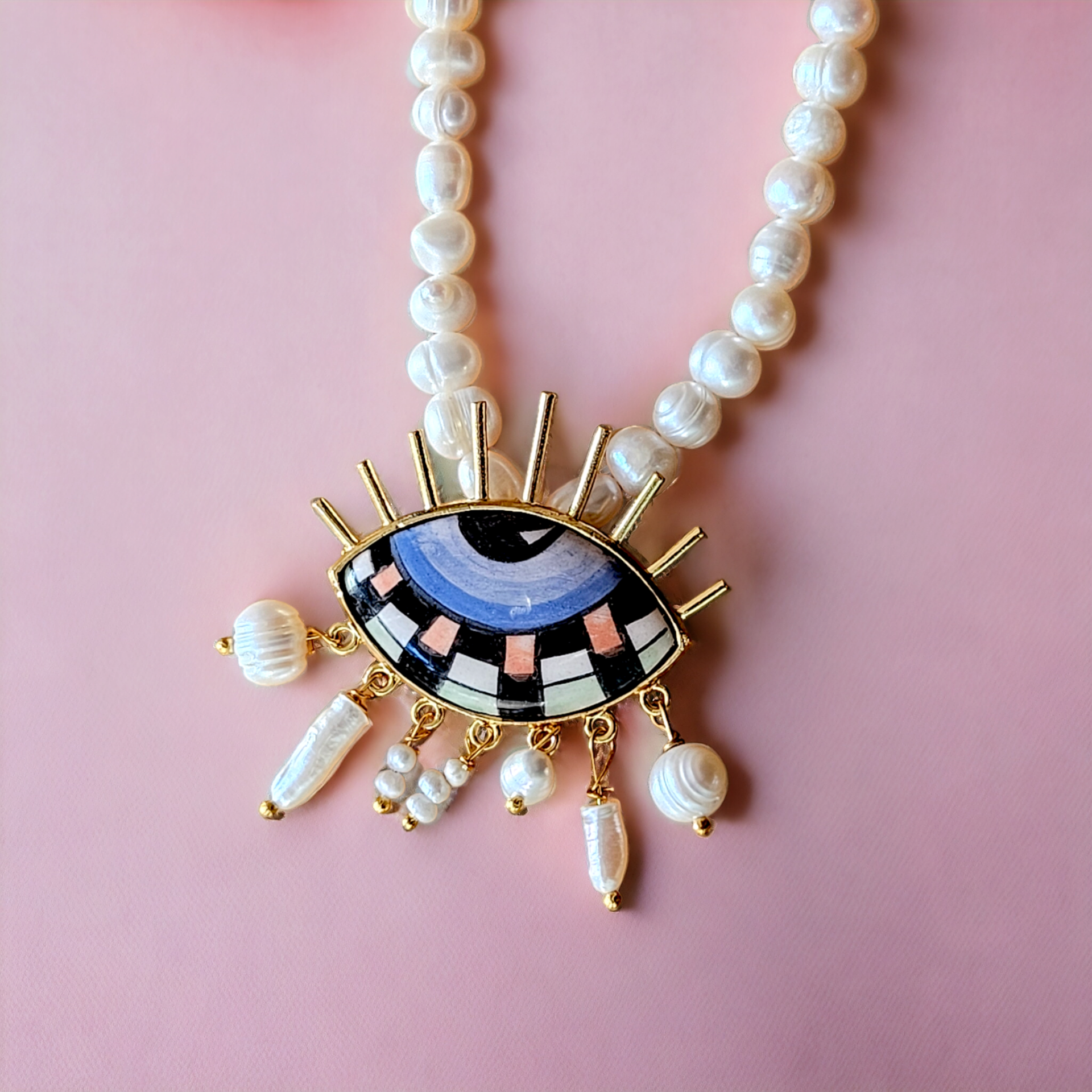 - Malzeme : Gerçek tatlı su incileri ve el yapımı seramik göz.