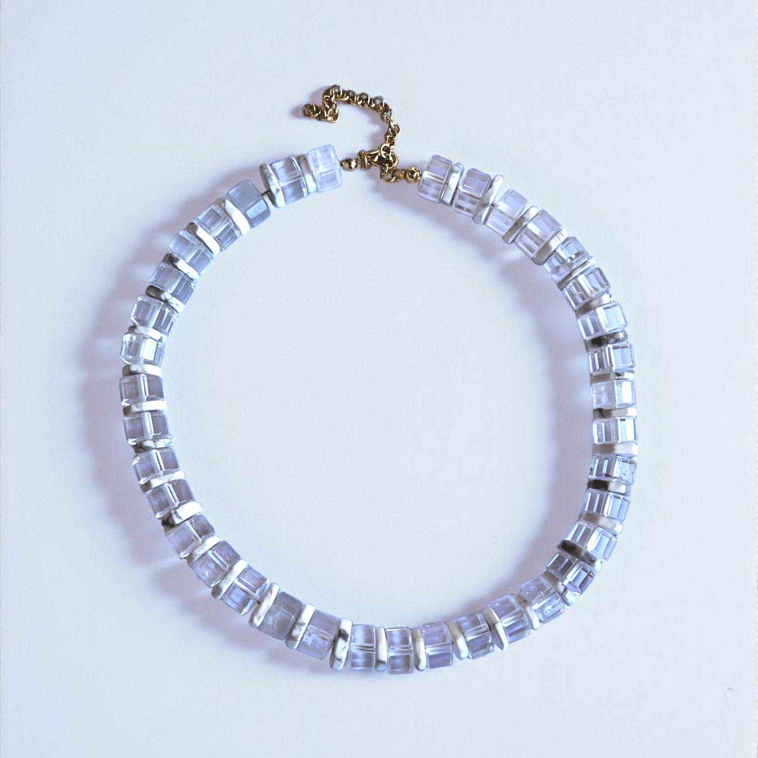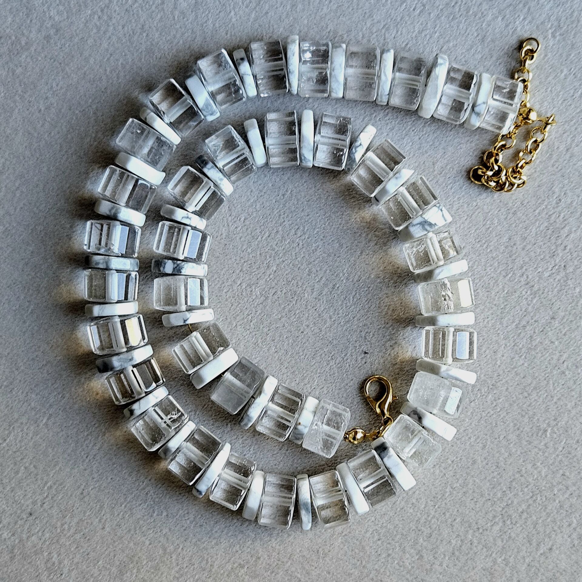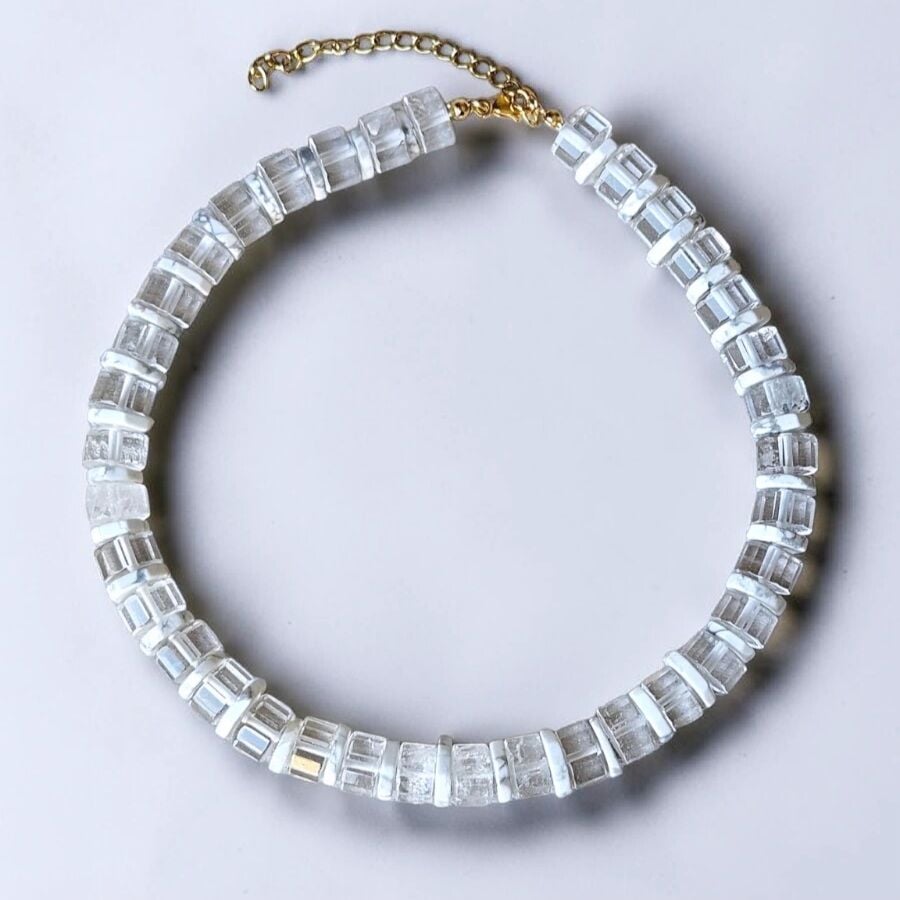- Malzeme : Kristal kuvars ve havlit doğal taşları ile yapılmıştır. Kapama aparatları pirinç üzeri altın kaplamadır.