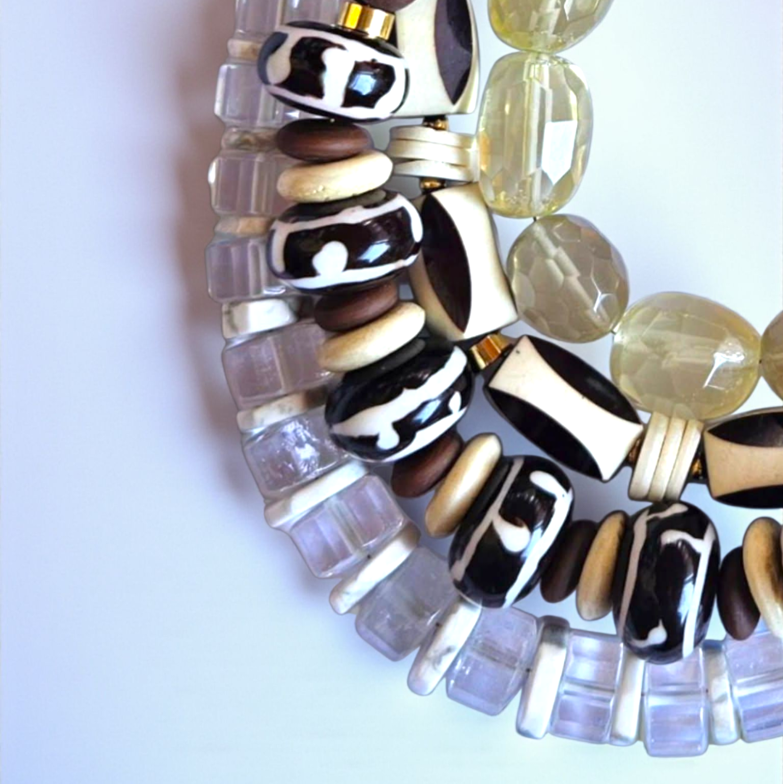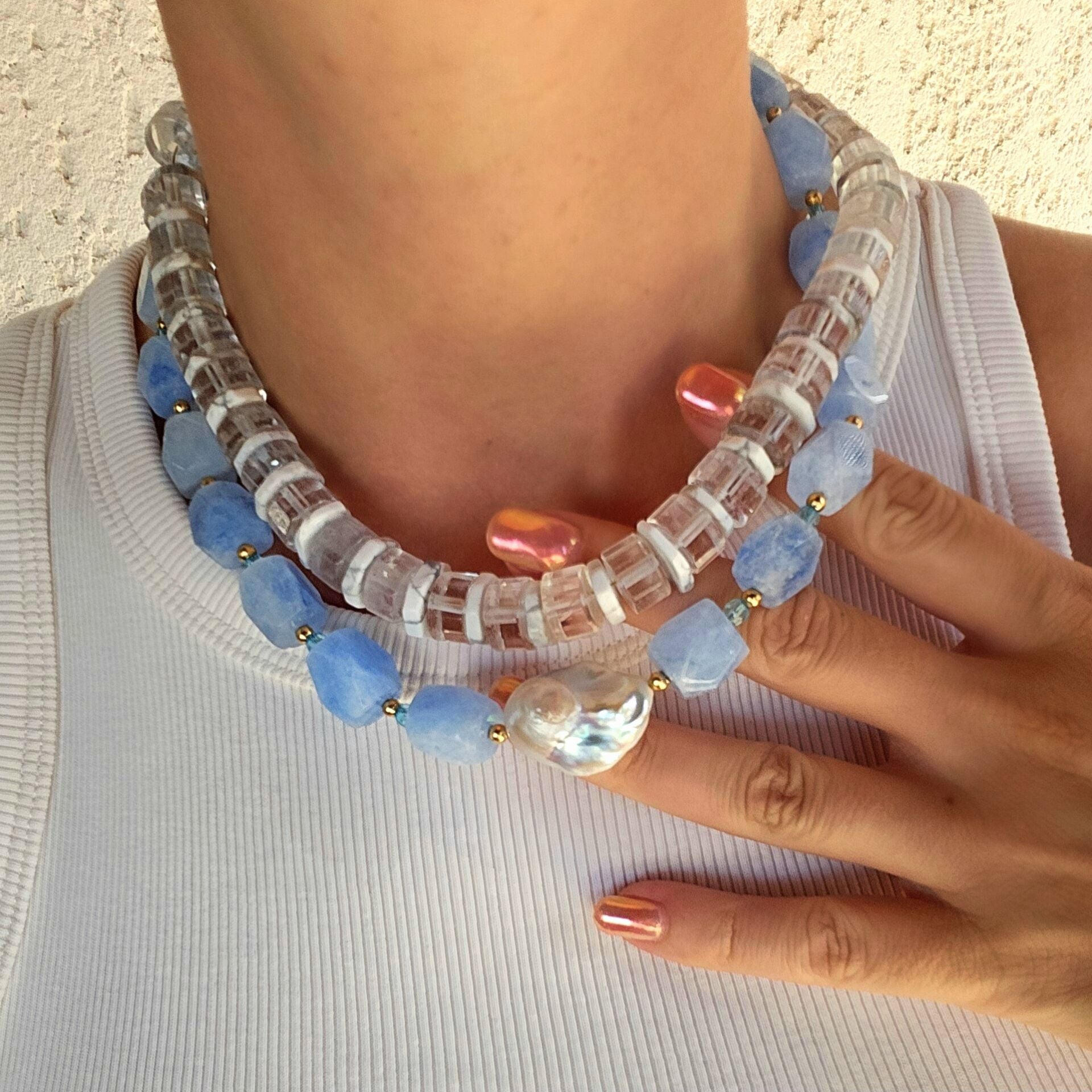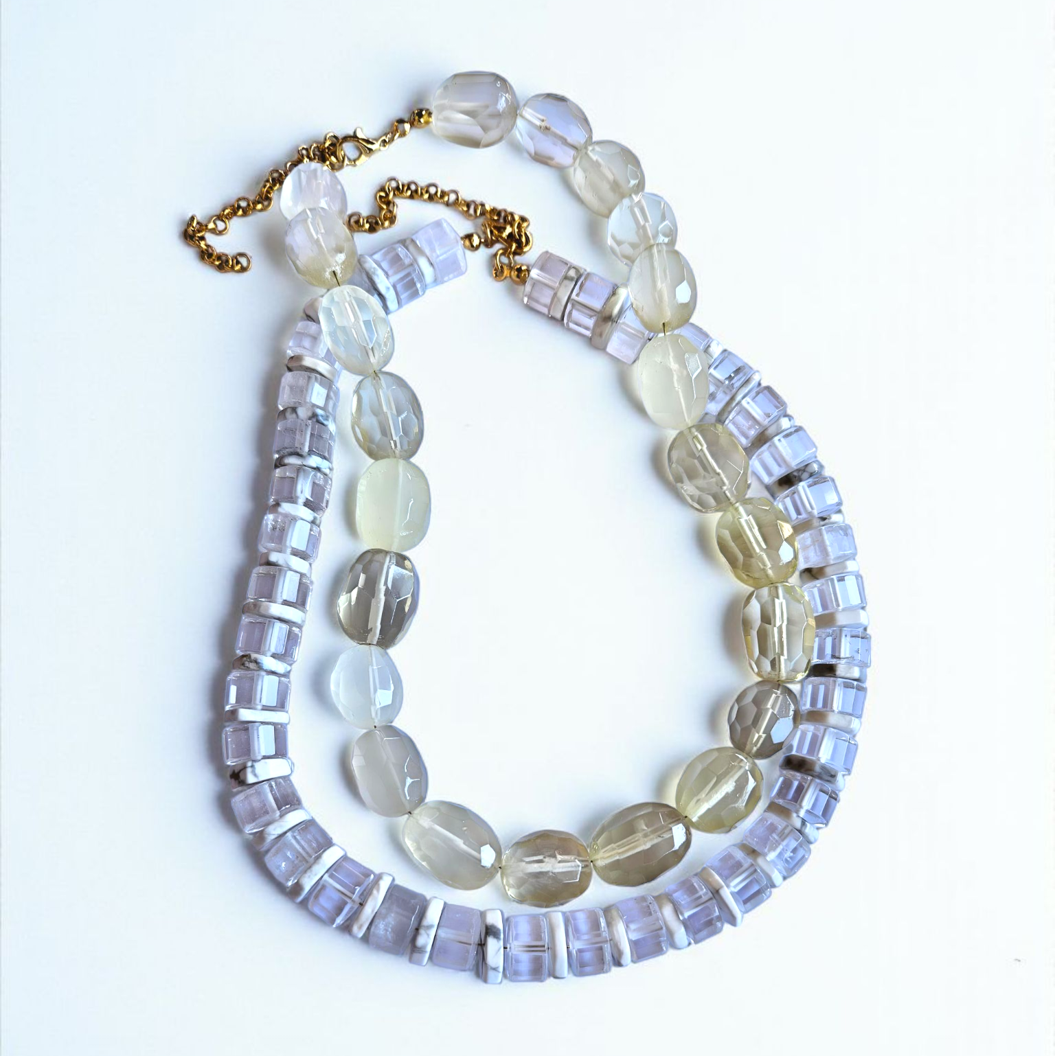 - Malzeme : Kristal kuvars ve havlit doğal taşları ile yapılmıştır. Kapama aparatları pirinç üzeri altın kaplamadır.