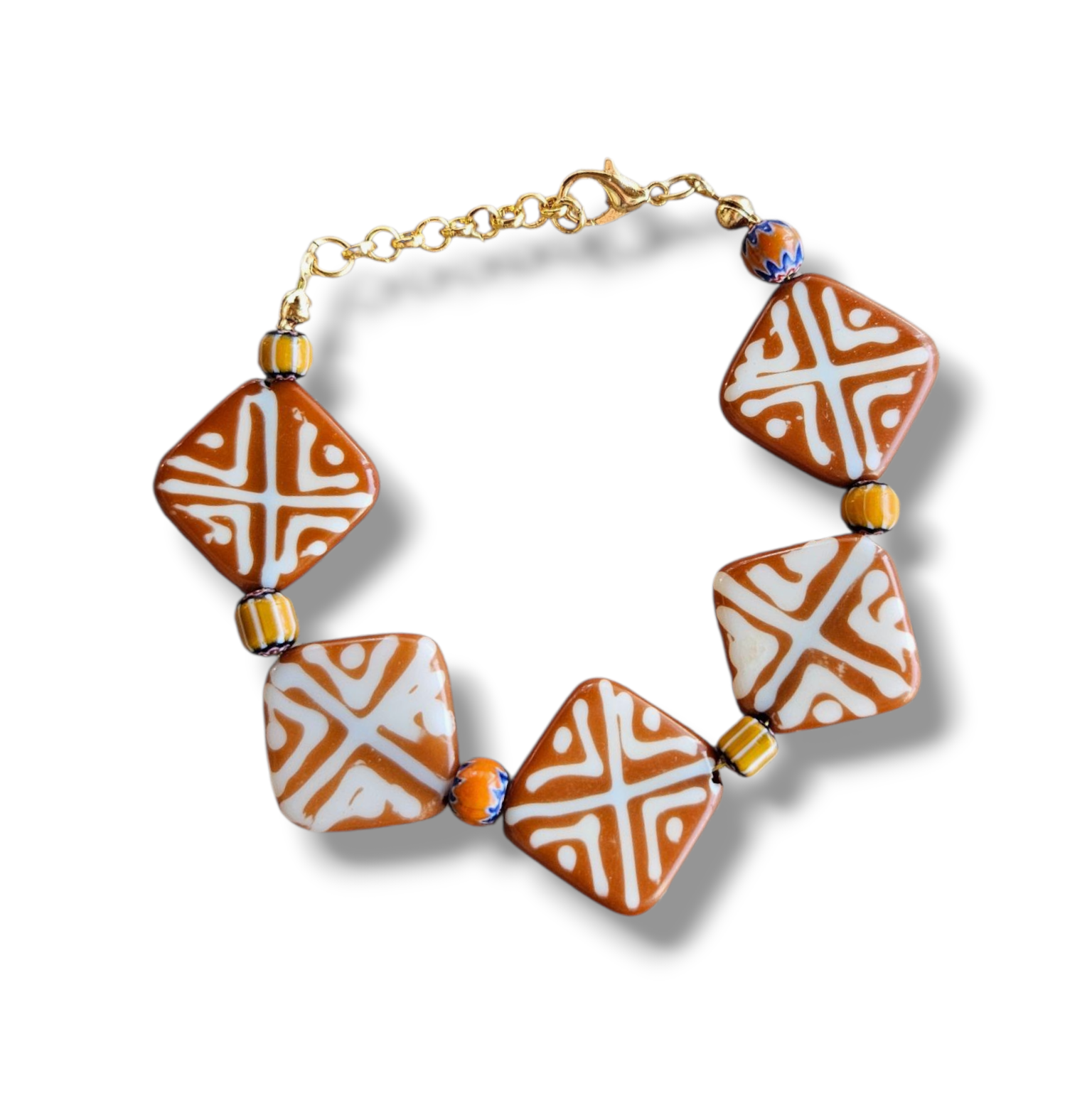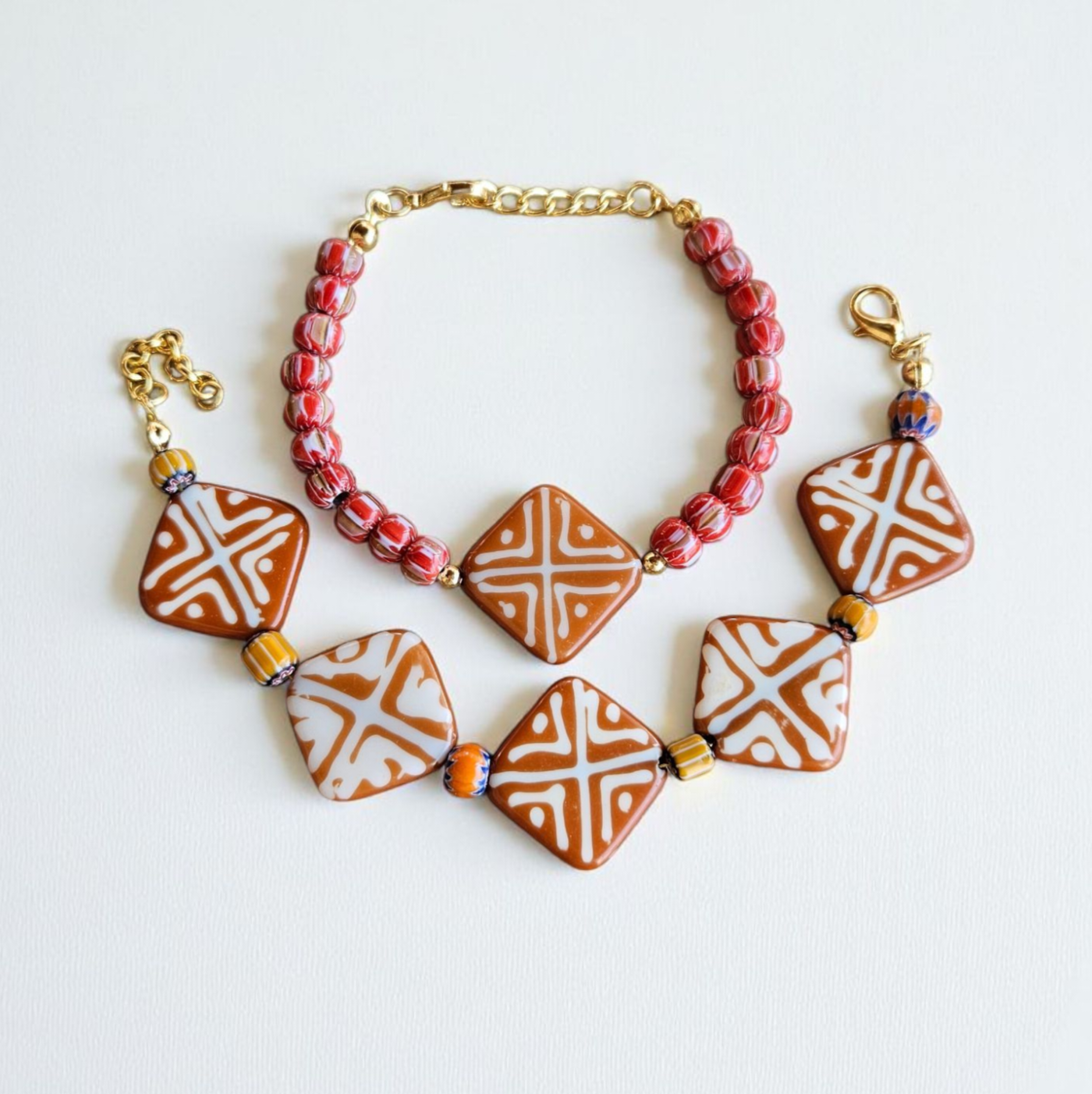 - Malzeme : Chevron afrika işi cam boncuk ve reçine boncuklar. Aparatlar pirinç üzeri altın kaplamadır.