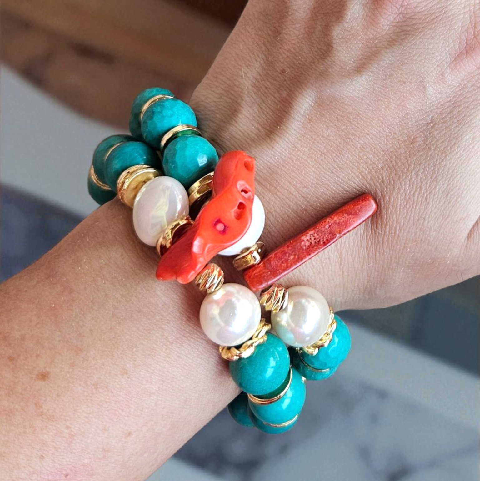- Malzeme : Turkuaz, mercan, mayorka inci ve altın kaplama aparatlar. Lastik bilezik olup, cok ince bileklerde hafif bol olmaktadır.