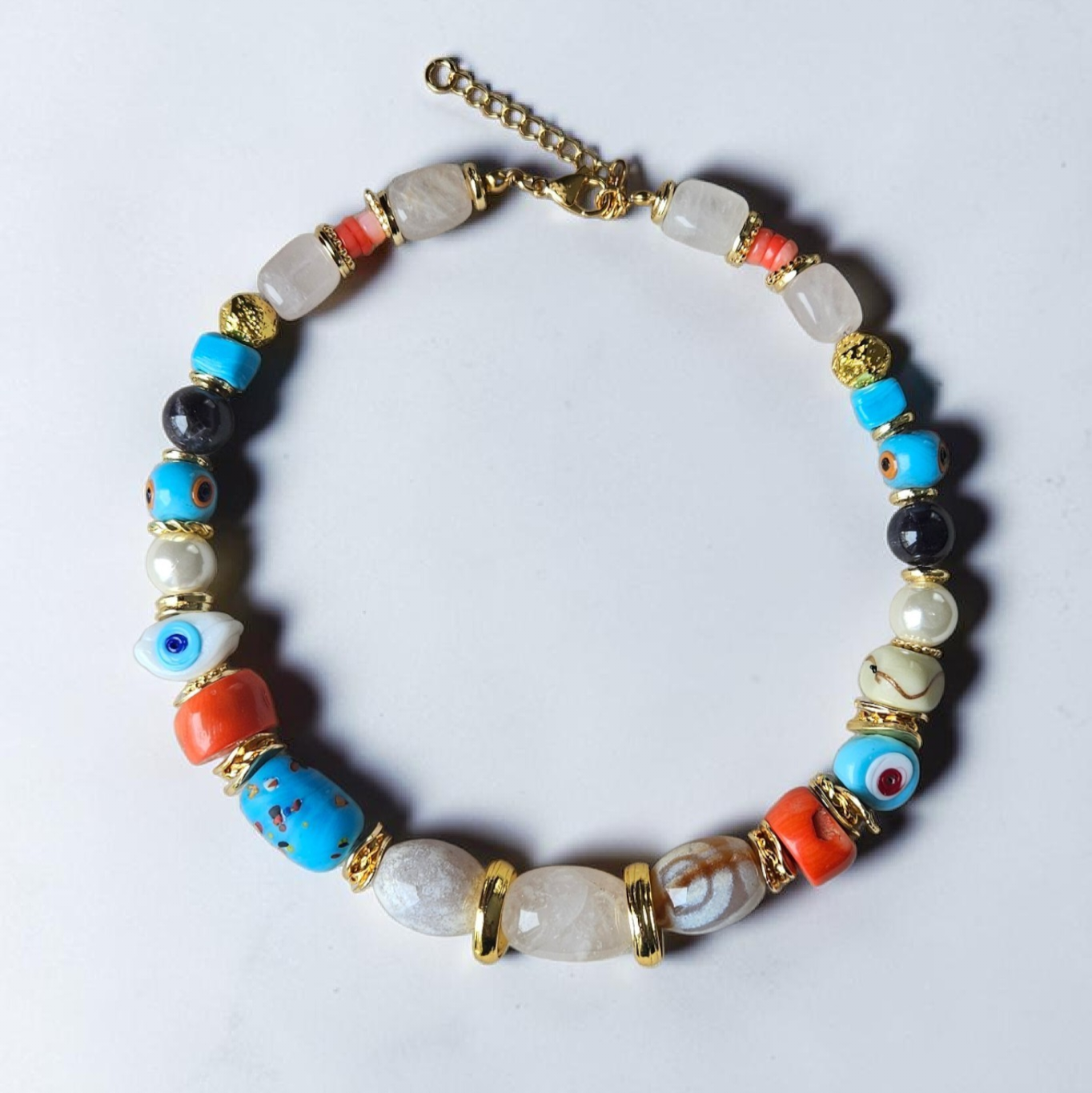 - Malzeme : Vivid doğal taş kolye, karışık doğal taş, cam ve seramik ile yapılmıştır. Aparatlar pirinç üzeri altın kaplamadır.