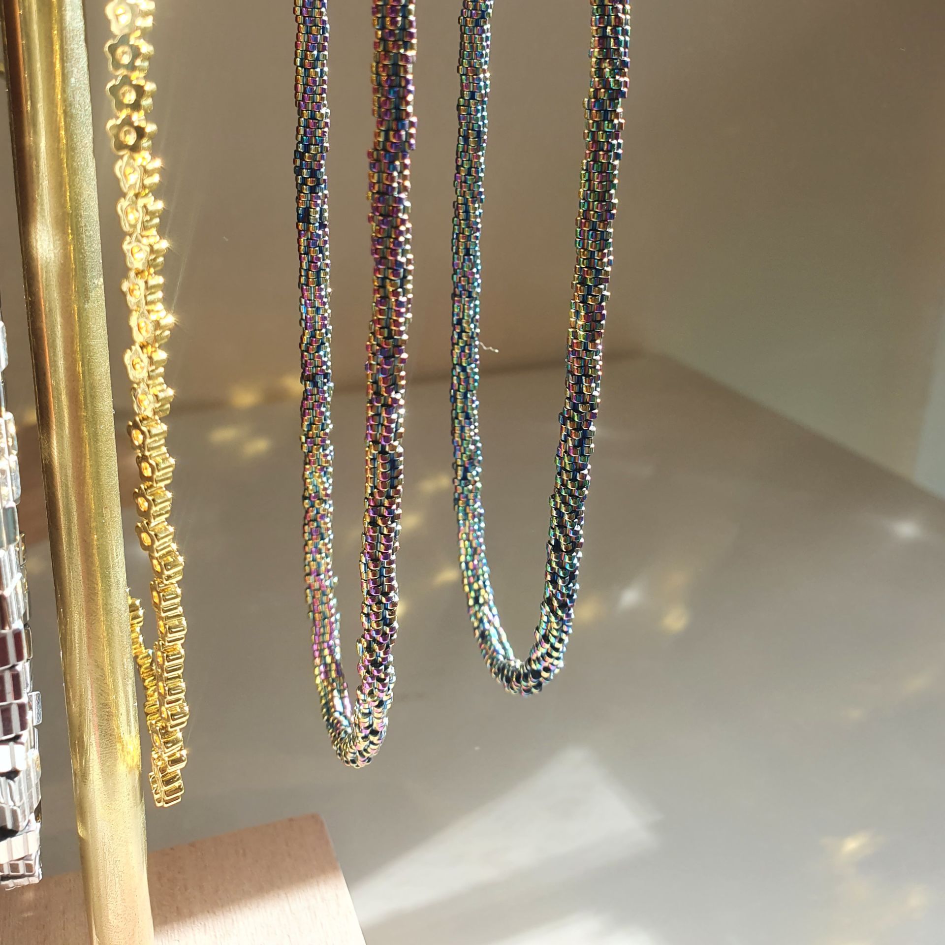 Çok renk yansımalı hematit boncuklar ile yapılmıştır. Uzun süre kullanım için kimyasal ve su temasından uzak tutulması önerilir.
